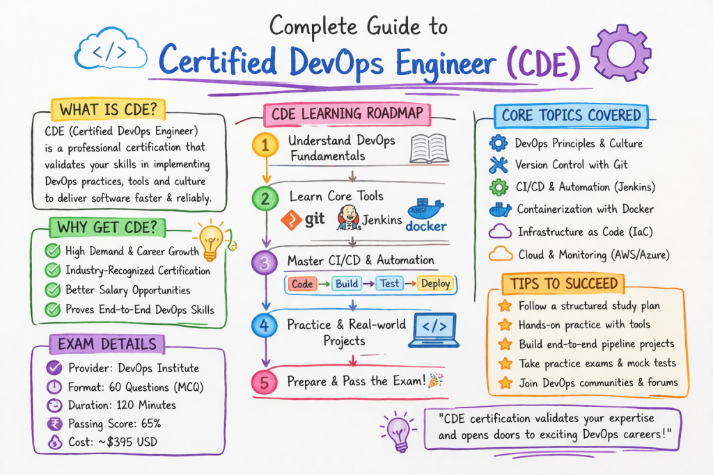 Certified DevOps Engineer (CDE) is a professional DevOps certification designed to validate your ability to work with core DevOps practices in real-world delivery environments. It focuses on the engineering side of DevOps, including automation, CI/CD, configuration management, infrastructure handling, and monitoring.